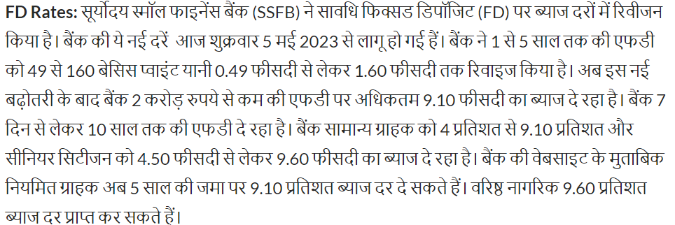 FD Rates: सूर्योदय स्मॉल फाइनेंस बैंक (SSFB) ने सावधि फिक्सड डिपॉजिट (FD) पर ब्याज दरों में रिवीजन किया है। बैंक की ये नई दरें आज शुक्रवार 5 मई 2023 से लागू हो गई हैं। बैंक ने 1 से 5 साल तक की एफडी को 49 से 160 बेसिस प्वाइंट यानी 0.49 फीसदी से लेकर 1.60 फीसदी तक रिवाइज किया है