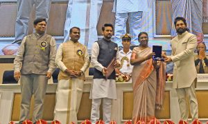 The President of India, Smt. Droupadi Murmu confers National Film Awards for the year 2021 under various categories at the 69th edition of the National Film Awards ceremony at Vigyan Bhavan, in New Delhi on October 17, 2023. The Union Minister for Information & Broadcasting, Youth Affairs and Sports, Shri Anurag Singh Thakur and other dignitaries are also present.