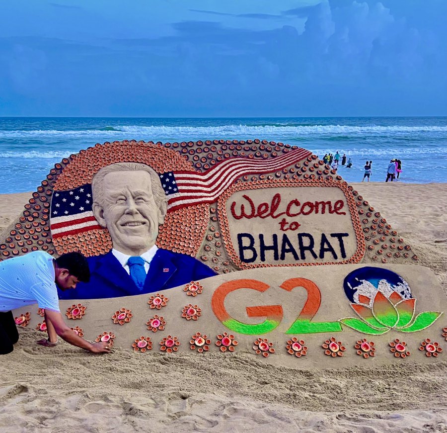 कैप्शन में लिखा है, “#भारत में आपका स्वागत है। #G20Summit के लिए अमेरिकी राष्ट्रपति @JoeBiden। मेरे सैंडआर्ट ने ओडिशा के पुरी बीच पर 2000 दीये रखे हैं।”
